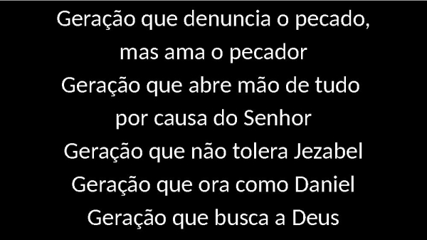 - Geração que denuncia o pecado,mas ama o pecadorGeração que abre mão de tudo por causa do SenhorGeração que não tolera JezabelGeração que ora como DanielGeração que busca a Deus