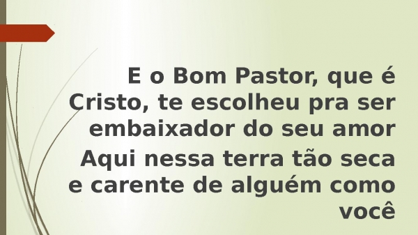 - E o Bom Pastor, que é Cristo, te escolheu pra ser embaixador do seu amor Aqui nessa terra tão seca e carente de alguém como você