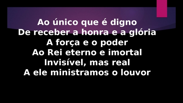 - Ao único que é dignoDe receber a honra e a glóriaA força e o poderAo Rei eterno e imortalInvisível, mas realA ele ministramos o louvor