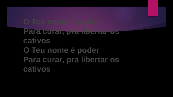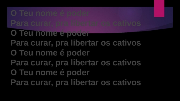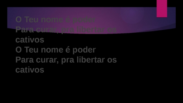 - O Teu nome é poderPara curar, pra libertar os cativosO Teu nome é poderPara curar, pra libertar os cativosO Teu nome é poderPara curar, pra libertar os cativosO Teu nome é poderPara curar, pra libertar os cativos