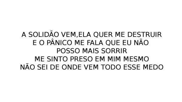 - A SOLIDÃO VEM,ELA QUER ME DESTRUIRE O PÂNICO ME FALA QUE EU NÃO POSSO MAIS SORRIRME SINTO PRESO EM MIM MESMONÃO SEI DE ONDE VEM TODO ESSE MEDO