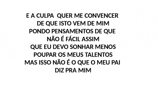 - E A CULPA QUER ME CONVENCER DE QUE ISTO VEM DE MIMPONDO PENSAMENTOS DE QUE NÃO É FÁCIL ASSIMQUE EU DEVO SONHAR MENOSPOUPAR OS MEUS TALENTOSMAS ISSO NÃO É O QUE O MEU PAI DIZ PRA MIM