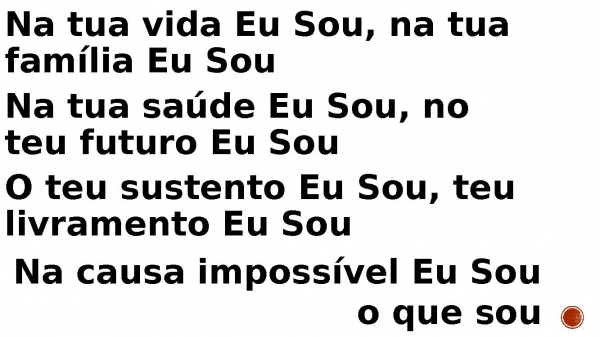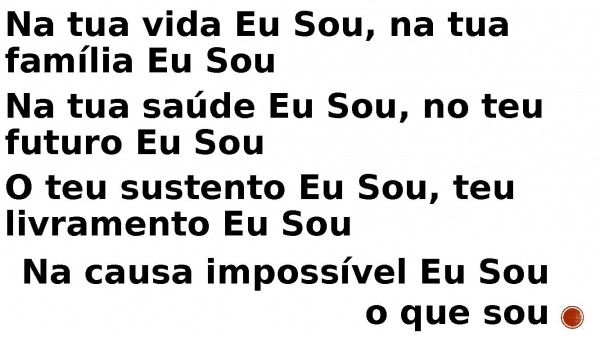 - Na tua vida Eu Sou, na tua família Eu Sou Na tua saúde Eu Sou, no teu futuro Eu Sou O teu sustento Eu Sou, teu livramento Eu Sou Na causa impossível Eu Sou o que sou