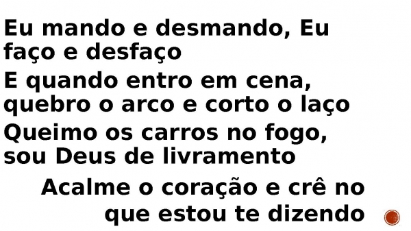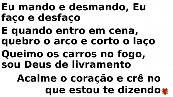 - Eu mando e desmando, Eu faço e desfaço E quando entro em cena, quebro o arco e corto o laço Queimo os carros no fogo, sou Deus de livramento Acalme o coração e crê no que estou te dizendo