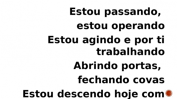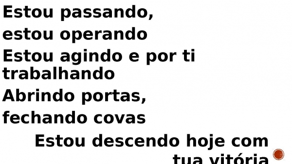 - Estou passando, estou operando Estou agindo e por ti trabalhando Abrindo portas, fechando covas Estou descendo hoje com tua vitória