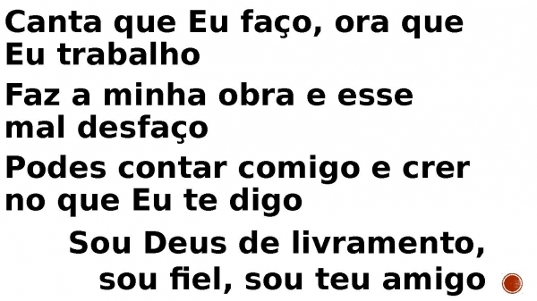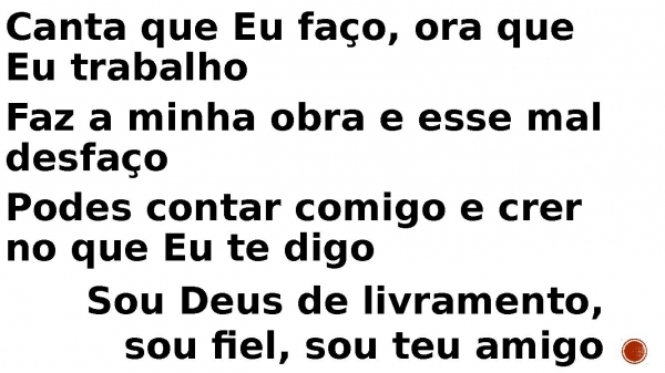 - Canta que Eu faço, ora que Eu trabalho Faz a minha obra e esse mal desfaço Podes contar comigo e crer no que Eu te digo Sou Deus de livramento, sou fiel, sou teu amigo