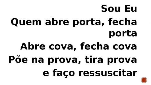 - Sou EuQuem abre porta, fecha portaAbre cova, fecha covaPõe na prova, tira prova e faço ressuscitar