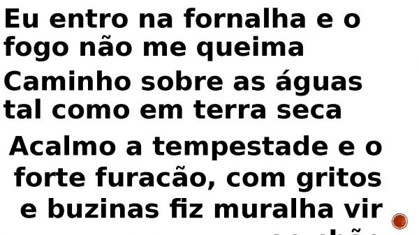 - Eu entro na fornalha e o fogo não me queima Caminho sobre as águas tal como em terra seca Acalmo a tempestade e o forte furacão, com gritos e buzinas fiz muralha vir ao chão
