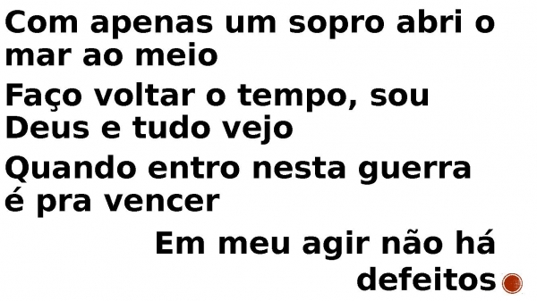- Com apenas um sopro abri o mar ao meio Faço voltar o tempo, sou Deus e tudo vejo Quando entro nesta guerra é pra vencer Em meu agir não há defeitos