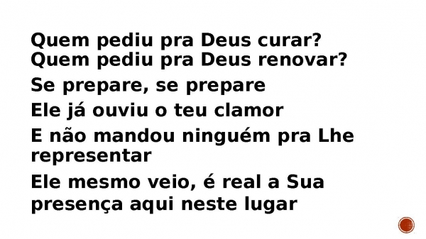 - Quem pediu pra Deus curar? Quem pediu pra Deus renovar? Se prepare, se prepare Ele já ouviu o teu clamor E não mandou ninguém pra Lhe representar Ele mesmo veio, é real a Sua presença aqui neste lugar