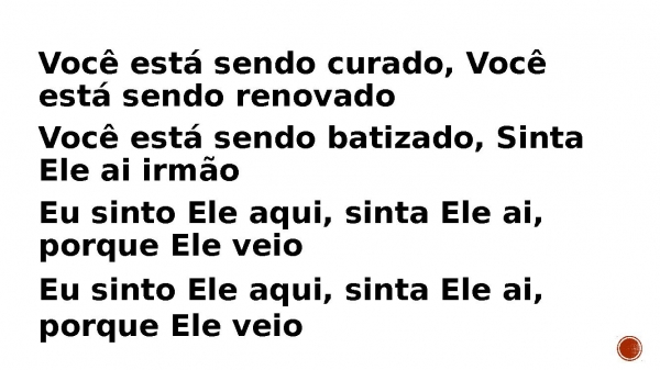 - Você está sendo curado, Você está sendo renovado Você está sendo batizado, Sinta Ele ai irmão Eu sinto Ele aqui, sinta Ele ai, porque Ele veio Eu sinto Ele aqui, sinta Ele ai, porque Ele veio