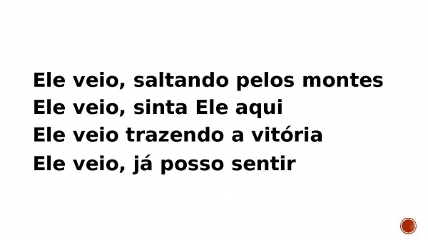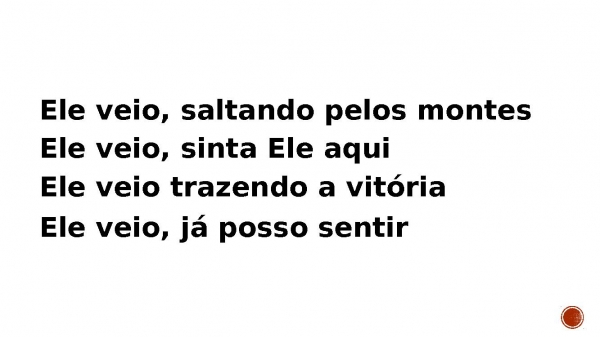 - Ele veio, saltando pelos montes Ele veio, sinta Ele aqui Ele veio trazendo a vitória Ele veio, já posso sentir