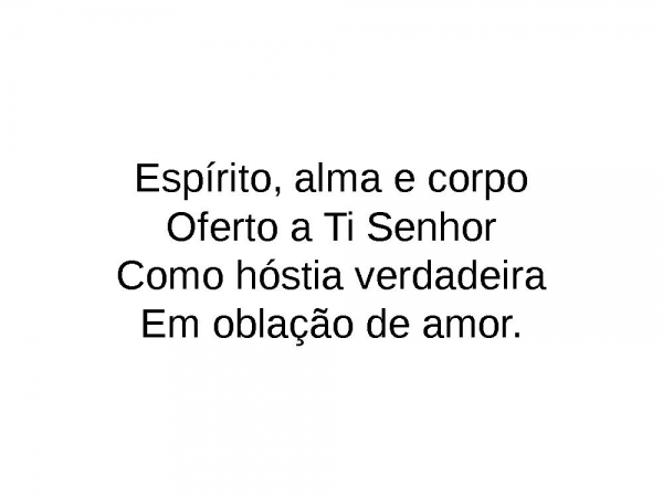 - Espírito, alma e corpoOferto a Ti SenhorComo hóstia verdadeiraEm oblação de amor.