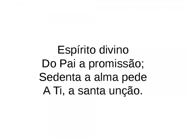 - Espírito divinoDo Pai a promissão;Sedenta a alma pedeA Ti, a santa unção.