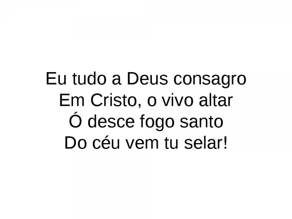 - Eu tudo a Deus consagroEm Cristo, o vivo altarÓ desce fogo santoDo céu vem tu selar!