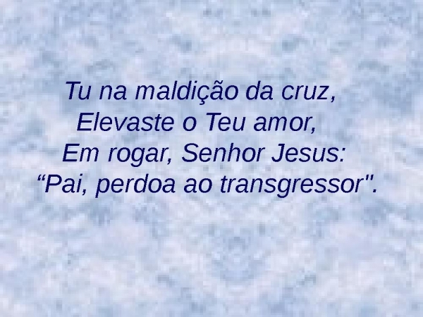- Tu na maldição da cruz, Elevaste o Teu amor, Em rogar, Senhor Jesus: “Pai, perdoa ao transgressor".