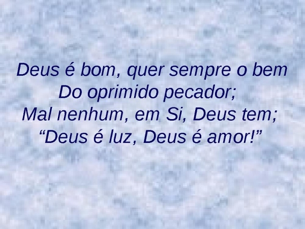 - Deus é bom, quer sempre o bem Do oprimido pecador; Mal nenhum, em Si, Deus tem; “Deus é luz, Deus é amor!”