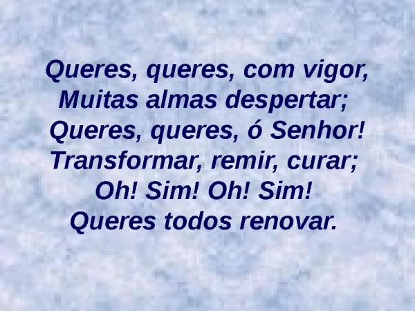 - Queres, queres, com vigor, Muitas almas despertar; Queres, queres, ó Senhor! Transformar, remir, curar; Oh! Sim! Oh! Sim! Queres todos renovar.