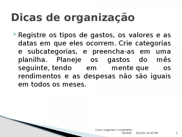 - Registre os tipos de gastos, os valores e as datas em que eles ocorrem. Crie categorias e subcategorias, e preencha-as em uma planilha. Planeje os gastos do mês seguinte, tendo em mente que os rendimentos e as despesas não são iguais em todos os meses.04/12/2014 23:48Como organizar o orçamento familiar.2Dicas de organização
