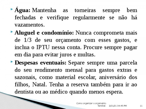 - Água: Mantenha as torneiras sempre bem fechadas e verifique regularmente se não há vazamentos.Aluguel e condomínio: Nunca comprometa mais de 1/3 de seu orçamento com esses gastos, e inclua o IPTU nessa conta. Procure sempre pagar em dia para evitar juros e multas.Despesas eventuais: Separe sempre uma parcela do seu rendimento mensal para gastos extras e sazonais, como material escolar, aniversário dos filhos, Natal. Tenha a reserva também para ir ao dentista ou ao médico quando menos espera.04/12/2014 23:49Como organizar o orçamento familiar.11