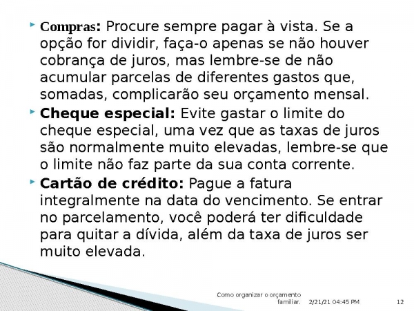 - Compras: Procure sempre pagar à vista. Se a opção for dividir, faça-o apenas se não houver cobrança de juros, mas lembre-se de não acumular parcelas de diferentes gastos que, somadas, complicarão seu orçamento mensal.Cheque especial: Evite gastar o limite do cheque especial, uma vez que as taxas de juros são normalmente muito elevadas, lembre-se que o limite não faz parte da sua conta corrente.Cartão de crédito: Pague a fatura integralmente na data do vencimento. Se entrar no parcelamento, você poderá ter dificuldade para quitar a dívida, além da taxa de juros ser muito elevada.04/12/2014 23:49Como organizar o orçamento familiar.12