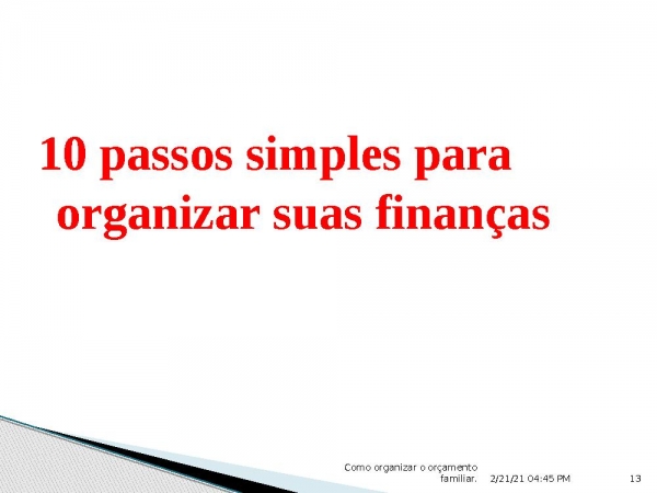 - 10 passos simples para organizar suas finanças04/12/2014 23:49Como organizar o orçamento familiar.13