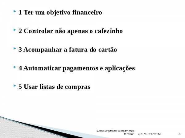 - 1 Ter um objetivo financeiro2 Controlar não apenas o cafezinho3 Acompanhar a fatura do cartão4 Automatizar pagamentos e aplicações5 Usar listas de compras04/12/2014 23:49Como organizar o orçamento familiar.14