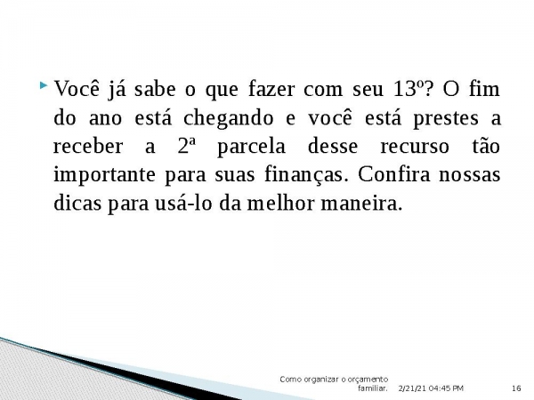 - Você já sabe o que fazer com seu 13º? O fim do ano está chegando e você está prestes a receber a 2ª parcela desse recurso tão importante para suas finanças. Confira nossas dicas para usá-lo da melhor maneira.04/12/2014 23:50Como organizar o orçamento familiar.16