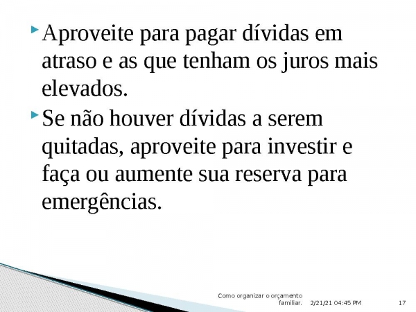 - Aproveite para pagar dívidas em atraso e as que tenham os juros mais elevados.Se não houver dívidas a serem quitadas, aproveite para investir e faça ou aumente sua reserva para emergências.04/12/2014 23:50Como organizar o orçamento familiar.17