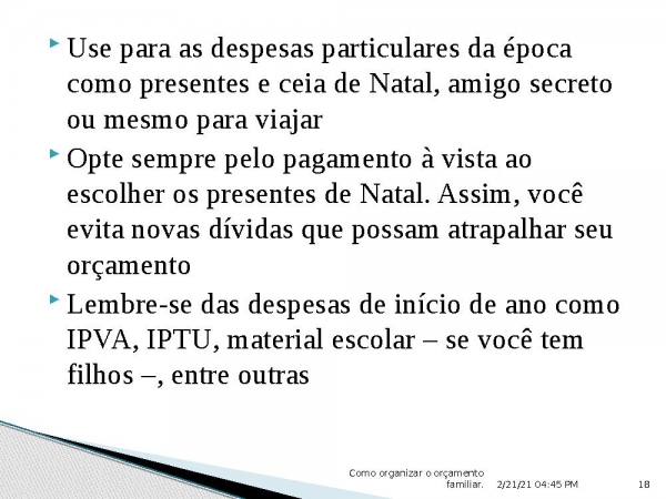 - Use para as despesas particulares da época como presentes e ceia de Natal, amigo secreto ou mesmo para viajarOpte sempre pelo pagamento à vista ao escolher os presentes de Natal. Assim, você evita novas dívidas que possam atrapalhar seu orçamentoLembre-se das despesas de início de ano como IPVA, IPTU, material escolar – se você tem filhos –, entre outras04/12/2014 23:50Como organizar o orçamento familiar.18