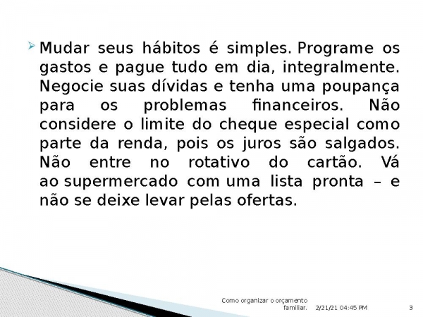 - Mudar seus hábitos é simples. Programe os gastos e pague tudo em dia, integralmente. Negocie suas dívidas e tenha uma poupança para os problemas financeiros. Não considere o limite do cheque especial como parte da renda, pois os juros são salgados. Não entre no rotativo do cartão. Vá ao supermercado com uma lista pronta – e não se deixe levar pelas ofertas.04/12/2014 23:48Como organizar o orçamento familiar.3