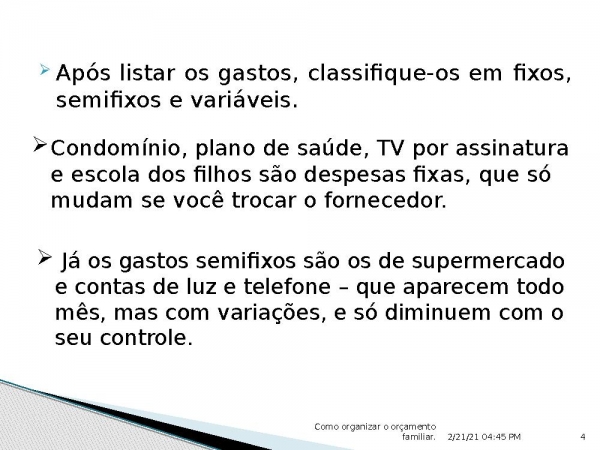 - Após listar os gastos, classifique-os em fixos, semifixos e variáveis. 04/12/2014 23:48Como organizar o orçamento familiar.4Condomínio, plano de saúde, TV por assinatura e escola dos filhos são despesas fixas, que só mudam se você trocar o fornecedor. Já os gastos semifixos são os de supermercado e contas de luz e telefone – que aparecem todo mês, mas com variações, e só diminuem com o seu controle.
