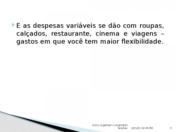 - E as despesas variáveis se dão com roupas, calçados, restaurante, cinema e viagens – gastos em que você tem maior flexibilidade.04/12/2014 23:48Como organizar o orçamento familiar.5