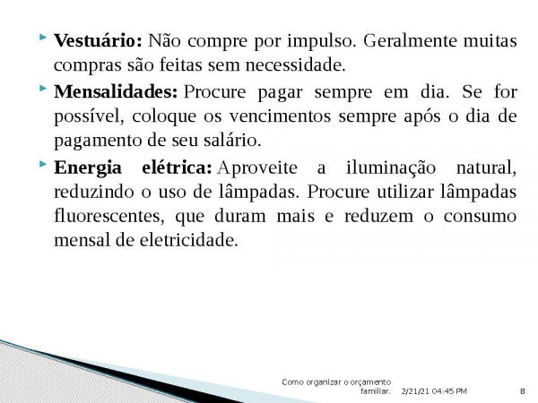 - Vestuário: Não compre por impulso. Geralmente muitas compras são feitas sem necessidade.Mensalidades: Procure pagar sempre em dia. Se for possível, coloque os vencimentos sempre após o dia de pagamento de seu salário.Energia elétrica: Aproveite a iluminação natural, reduzindo o uso de lâmpadas. Procure utilizar lâmpadas fluorescentes, que duram mais e reduzem o consumo mensal de eletricidade.04/12/2014 23:49Como organizar o orçamento familiar.8