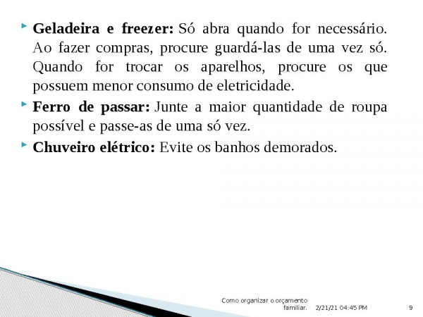 - Geladeira e freezer: Só abra quando for necessário. Ao fazer compras, procure guardá-las de uma vez só. Quando for trocar os aparelhos, procure os que possuem menor consumo de eletricidade.Ferro de passar: Junte a maior quantidade de roupa possível e passe-as de uma só vez.Chuveiro elétrico: Evite os banhos demorados.04/12/2014 23:49Como organizar o orçamento familiar.9