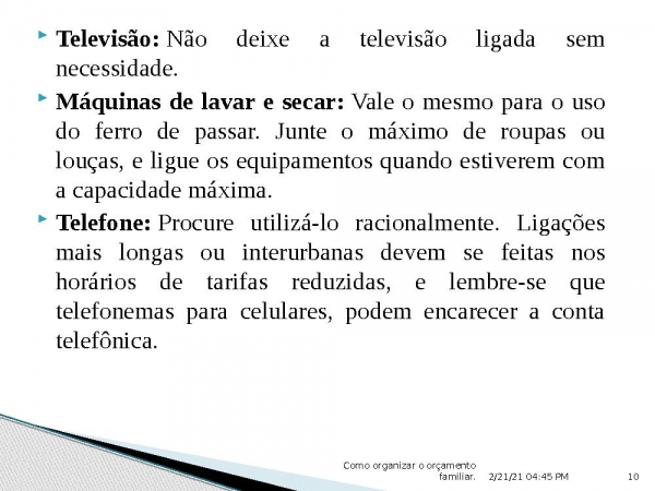 - Televisão: Não deixe a televisão ligada sem necessidade.Máquinas de lavar e secar: Vale o mesmo para o uso do ferro de passar. Junte o máximo de roupas ou louças, e ligue os equipamentos quando estiverem com a capacidade máxima.Telefone: Procure utilizá-lo racionalmente. Ligações mais longas ou interurbanas devem se feitas nos horários de tarifas reduzidas, e lembre-se que telefonemas para celulares, podem encarecer a conta telefônica.04/12/2014 23:49Como organizar o orçamento familiar.10