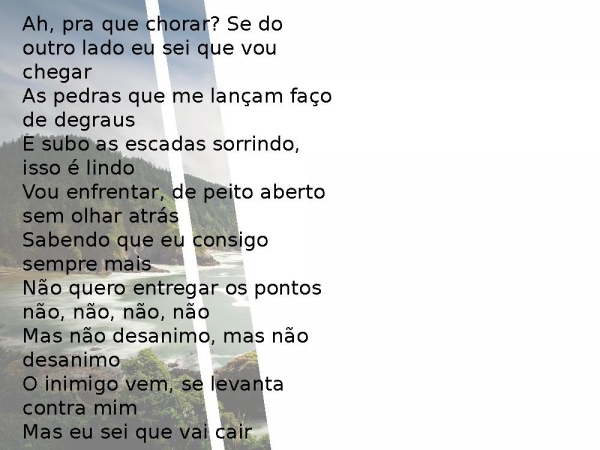 - Ah, pra que chorar? Se do outro lado eu sei que vou chegarAs pedras que me lançam faço de degrausE subo as escadas sorrindo, isso é lindoVou enfrentar, de peito aberto sem olhar atrásSabendo que eu consigo sempre maisNão quero entregar os pontos não, não, não, nãoMas não desanimo, mas não desanimoO inimigo vem, se levanta contra mimMas eu sei que vai cair