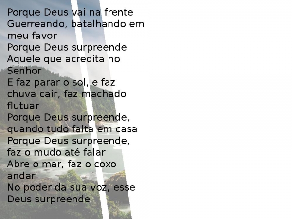 - Porque Deus vai na frenteGuerreando, batalhando em meu favorPorque Deus surpreendeAquele que acredita no SenhorE faz parar o sol, e faz chuva cair, faz machado flutuarPorque Deus surpreende, quando tudo falta em casaPorque Deus surpreende, faz o mudo até falarAbre o mar, faz o coxo andarNo poder da sua voz, esse Deus surpreende