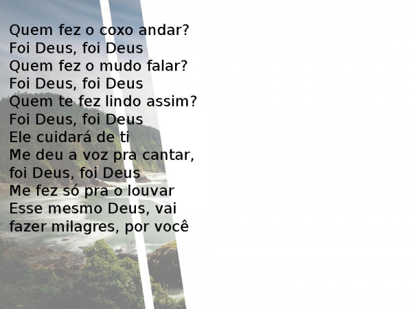 - Quem fez o coxo andar? Foi Deus, foi DeusQuem fez o mudo falar? Foi Deus, foi DeusQuem te fez lindo assim? Foi Deus, foi DeusEle cuidará de tiMe deu a voz pra cantar, foi Deus, foi DeusMe fez só pra o louvarEsse mesmo Deus, vai fazer milagres, por você