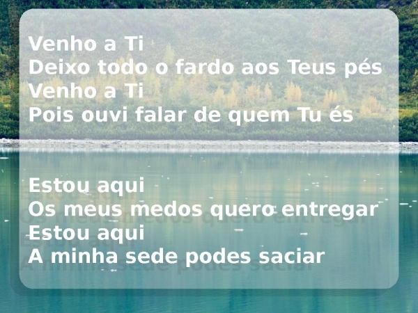 - Venho a TiDeixo todo o fardo aos Teus pésVenho a TiPois ouvi falar de quem Tu ésEstou aquiOs meus medos quero entregarEstou aquiA minha sede podes saciar