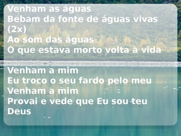 - Venham as águasBebam da fonte de águas vivas (2x)Ao som das águasO que estava morto volta à vidaVenham a mimEu troco o seu fardo pelo meuVenham a mimProvai e vede que Eu sou teu Deus
