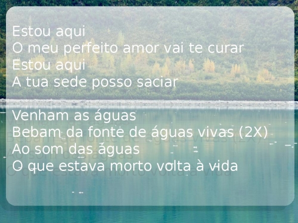 - Estou aquiO meu perfeito amor vai te curarEstou aquiA tua sede posso saciarVenham as águasBebam da fonte de águas vivas (2X)Ao som das águasO que estava morto volta à vida