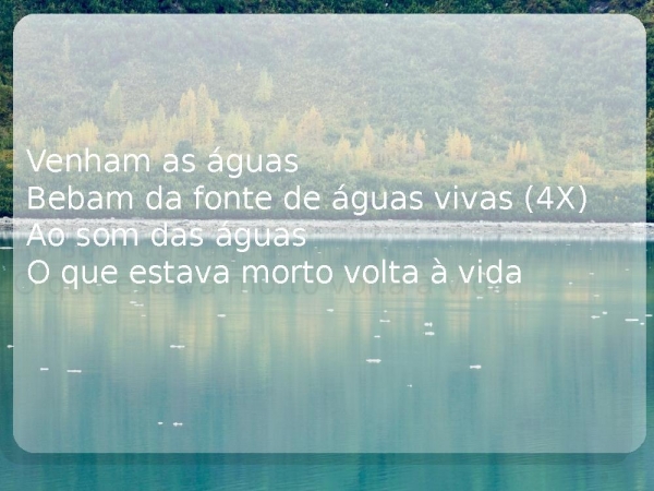 - Venham as águasBebam da fonte de águas vivas (4X)Ao som das águasO que estava morto volta à vida