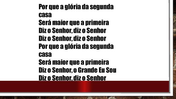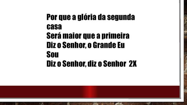 - Por que a glória da segunda casaSerá maior que a primeiraDiz o Senhor, diz o SenhorDiz o Senhor, diz o SenhorPor que a glória da segunda casaSerá maior que a primeiraDiz o Senhor, o Grande Eu SouDiz o Senhor, diz o Senhor