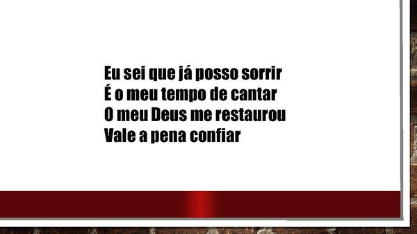 - Eu sei que já posso sorrirÉ o meu tempo de cantarO meu Deus me restaurouVale a pena confiar