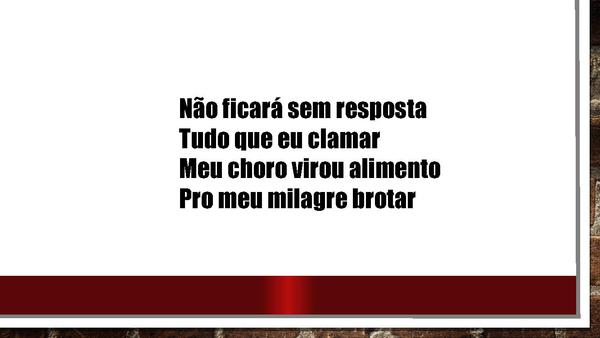 - Não ficará sem respostaTudo que eu clamarMeu choro virou alimentoPro meu milagre brotar