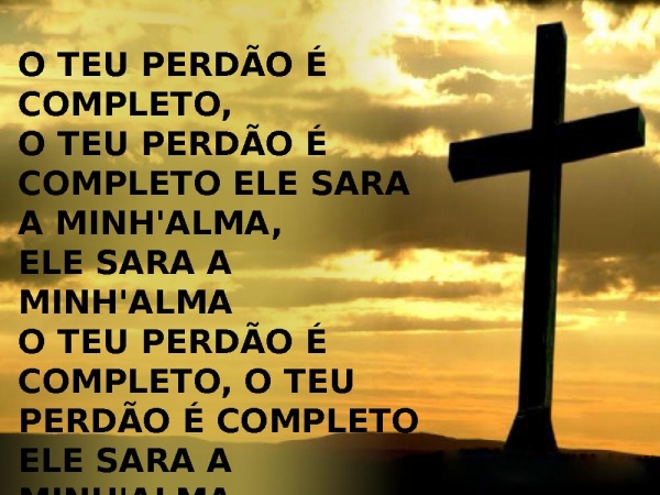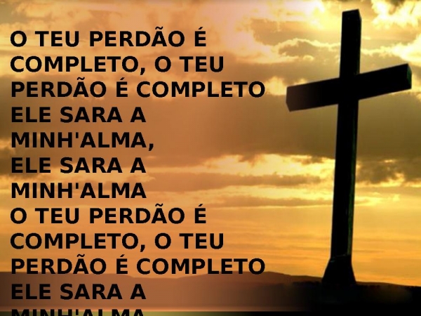 - O TEU PERDÃO É COMPLETO, O TEU PERDÃO É COMPLETO ELE SARA A MINH'ALMA,ELE SARA A MINH'ALMA O TEU PERDÃO É COMPLETO, O TEU PERDÃO É COMPLETO ELE SARA A MINH'ALMA, ELE SARA A MINH'ALMA