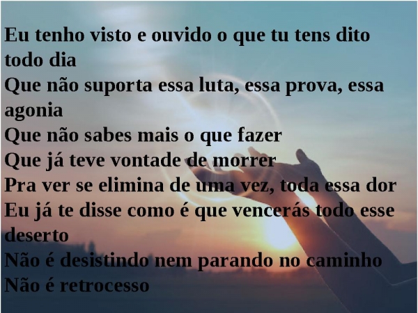 - Eu tenho visto e ouvido o que tu tens dito todo dia Que não suporta essa luta, essa prova, essa agonia Que não sabes mais o que fazer Que já teve vontade de morrer Pra ver se elimina de uma vez, toda essa dor Eu já te disse como é que vencerás todo esse deserto Não é desistindo nem parando no caminho Não é retrocesso