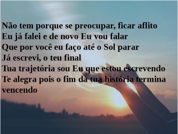 - Não tem porque se preocupar, ficar aflito Eu já falei e de novo Eu vou falar Que por você eu faço até o Sol parar Já escrevi, o teu final Tua trajetória sou Eu que estou escrevendo Te alegra pois o fim da tua história termina vencendo