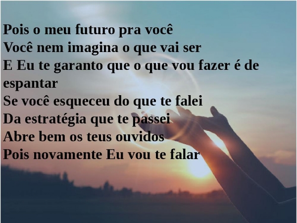 - Pois o meu futuro pra você Você nem imagina o que vai ser E Eu te garanto que o que vou fazer é de espantar Se você esqueceu do que te falei Da estratégia que te passei Abre bem os teus ouvidos Pois novamente Eu vou te falar